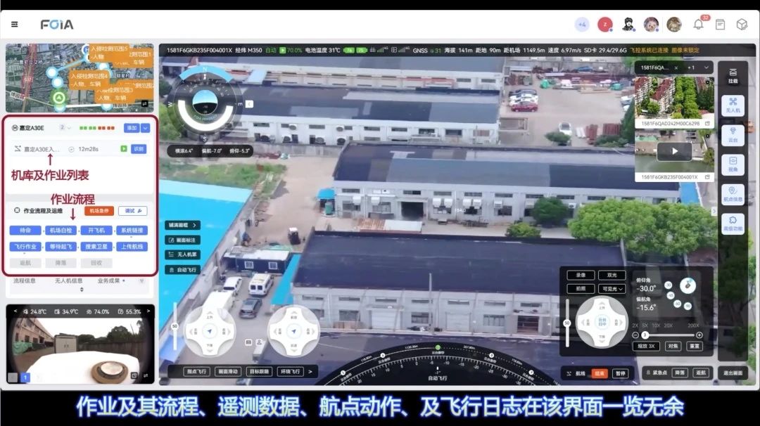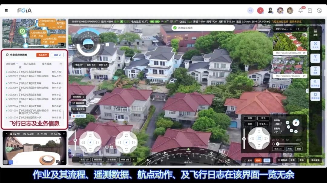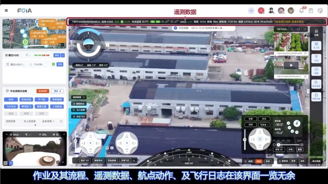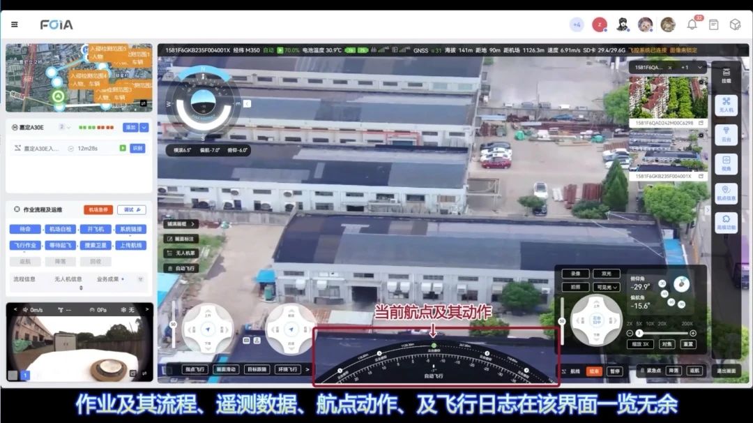 界面展示豐富的飛行信息:在復亞無人機管理平臺畫面中除了實時視頻和地圖,還會顯示所需的飛行信息,例如作業流程、遙測數據、航點位置及動作等,豐富的數據使得操作人員可以多維度了解各航線飛行情況。